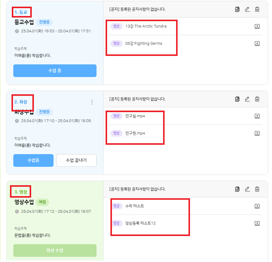 | Description | [ECP] 과목 > 동영상 보기에서 노출되는 영상이 모두 '등교'로 노출되는 현상 등교 수업으로 등록한 영상은 등교 화상 수업으로 등록한 영상은 화상 영상 수업으로 등록한 영상은 영상 으로 노출되어야 하는데 모두 '등교'로 노출 | ||||