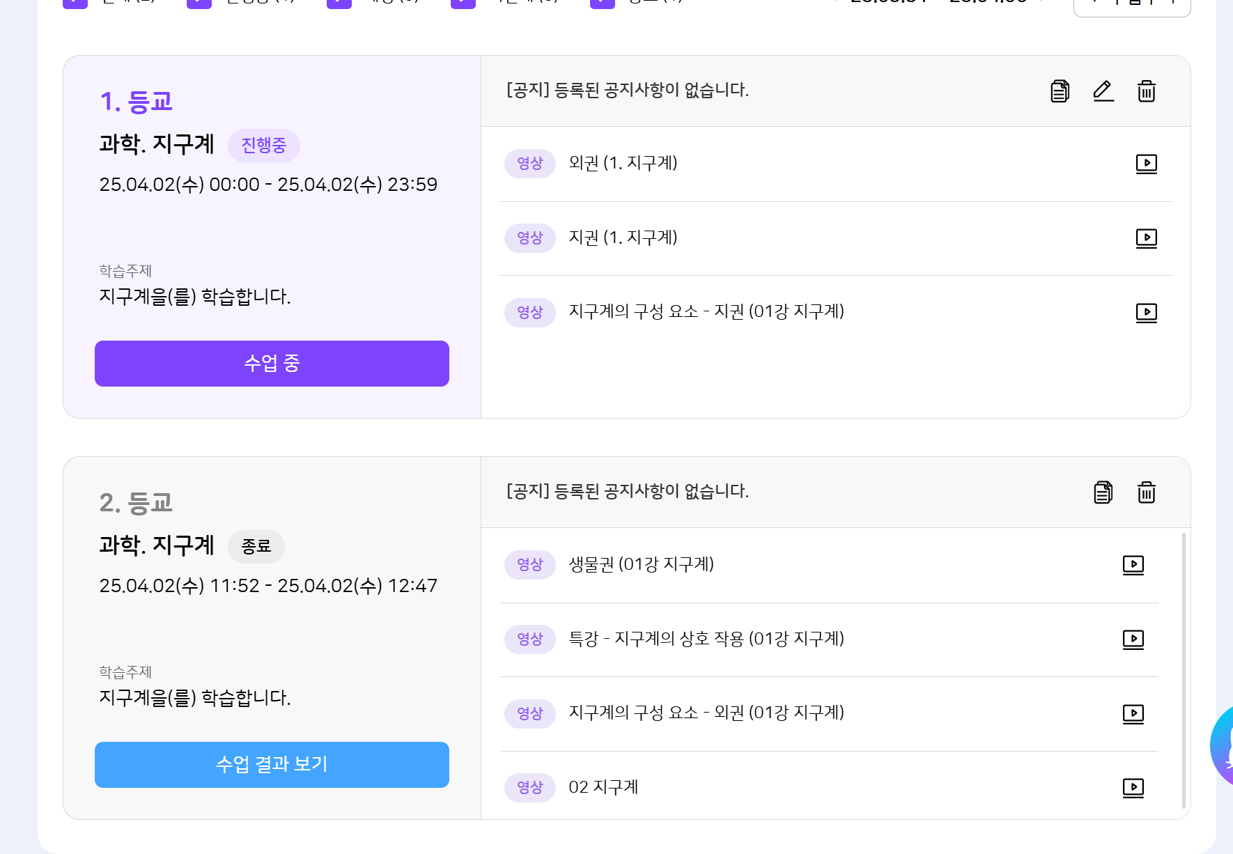 | Steps To Reproduce | 1. 수업 설계 2. 중1 과학 > 지권의 변화 > 지구계와 지권 > 지구계 3. 수업 영상 > 영상 > 추천 영상 추가 4. 저장 후 영상명 확인 | ||||