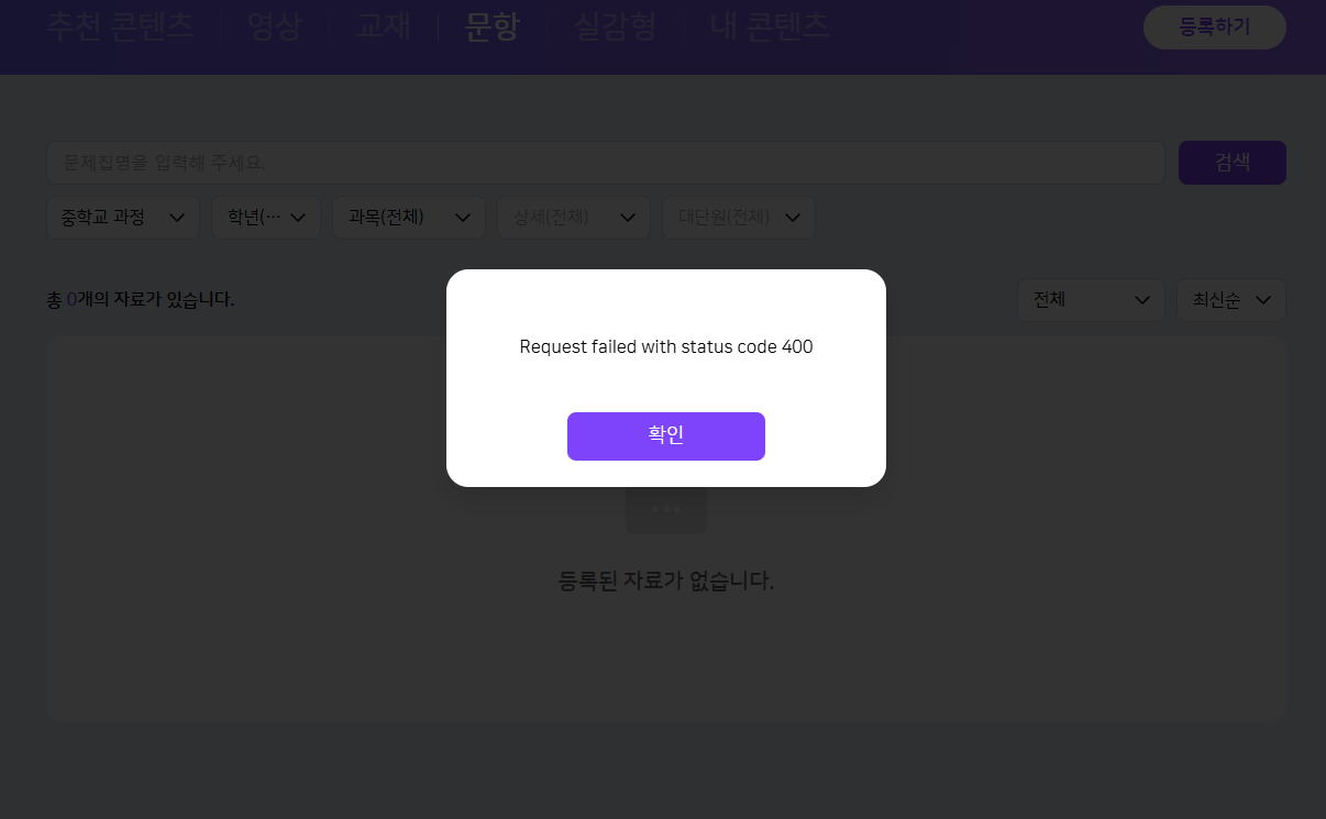 | Description | [ECP] 중고등학교 교사가 학습콘텐츠 > 문항 진입시 400에러 발생 | ||||