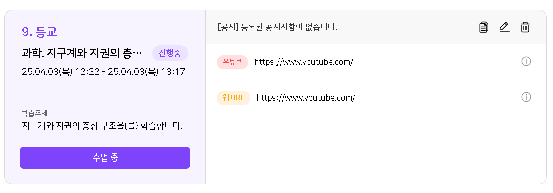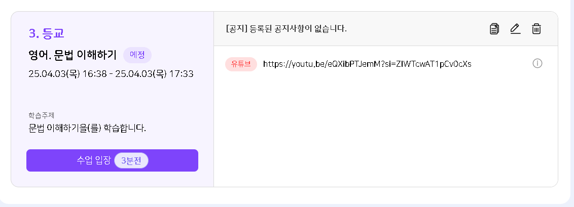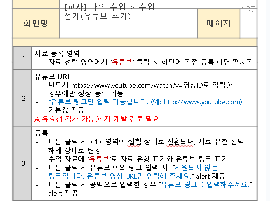 | 2025-04-03 05:42 | 육현웅 | Summary | (ECP) 수업 생성 - 유튜브 링크에 "watch?v="이 없어도 등록되는 현상 => (ECP) 수업 생성 - 유튜브 콘텐츠 첨부시 특정 링크는 오류팝업이 노출되지 않는 현상 |