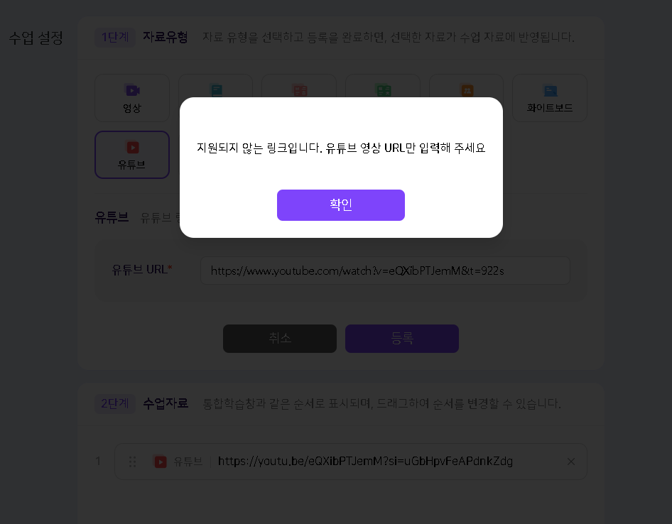 | Summary | 0000784: (ECP) 수업 생성 - 유튜브 콘텐츠 첨부시 특정 링크는 오류팝업이 노출되지 않는 현상 | ||||