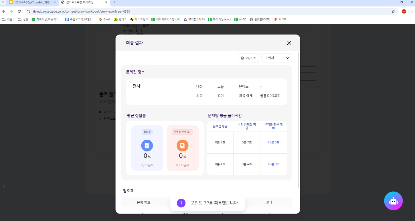 | Description | 배포된 콘텐츠-문제집 [최종 결과지 보기] 버튼 클릭 시 3P 획득한다는 토스트 팝업 노출 | ||||