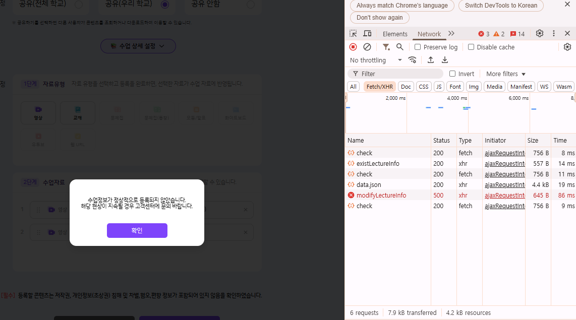 | Description | 등교, 화상 수업 설계 후 영상 수업으로 수정 시도 시 에러 발생 | ||||
