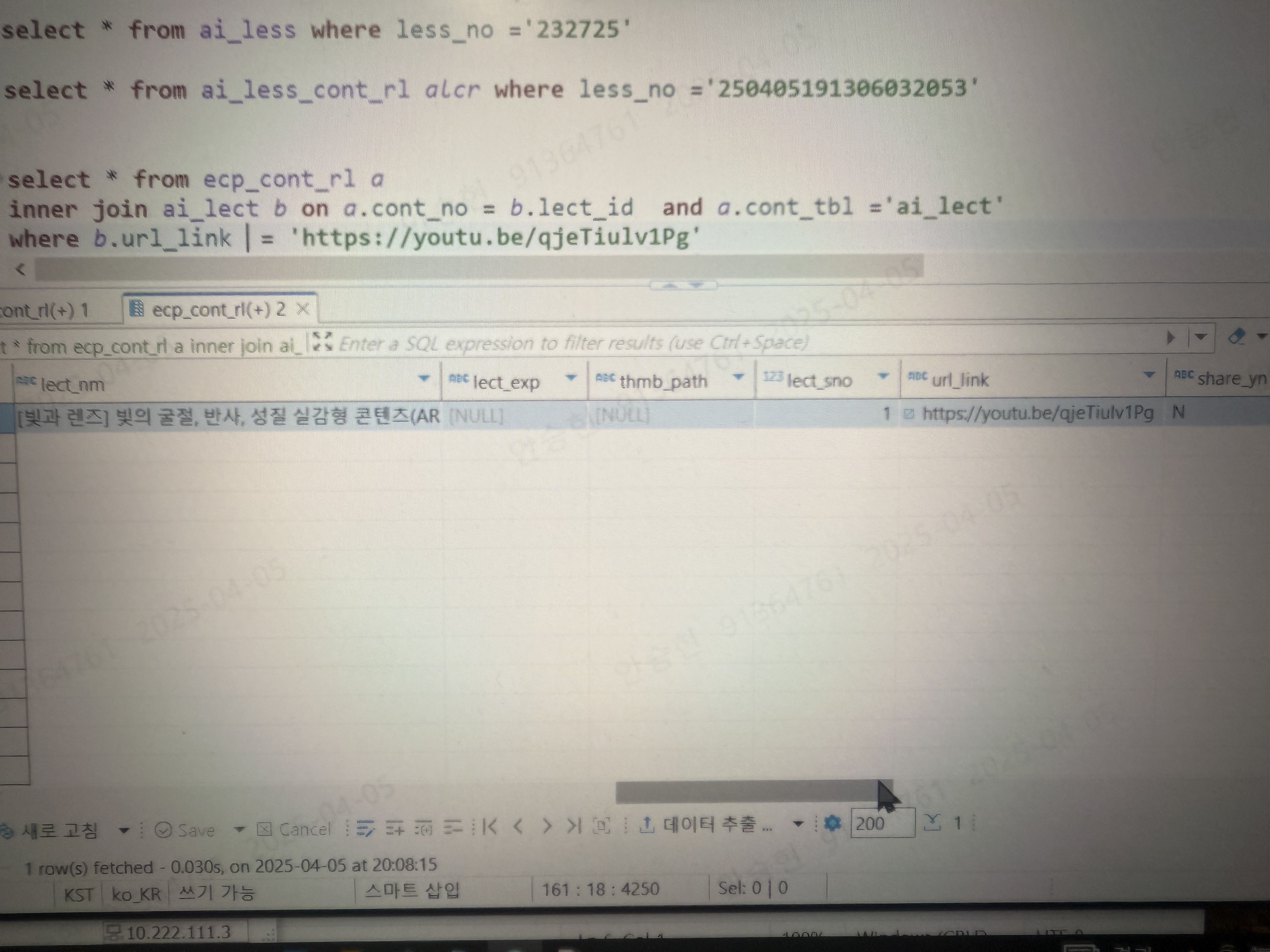 1. 마이그레이션 전후 "수업유형" 다르다는 문제 데이터 확인결과-> 데이터 정상적으로 들어 있음 [퍼닌] 확인 필요 ## ai_less table less_no less_nm cls_type 233955 사회화상1 ON 233958 사회영상1 VOD => 하이러닝 DB에도 위와 같이 되어있습니다. 3. 마이그레이션 전후 "업로드구분" 다르다는 문제 데이터 확인결과-> 마이그레이션 전후 DB 내용 확인결과 모두 LINK 였음 [퍼닌] 확인 필요 # ai_lect lect_id lect_nm service_clsfn upload_clsfn url_link AI 0000031867 [빛과 렌즈] 빛의 굴절, 반사, 색깔 실감형 콘텐츠(AR 빛 실험실) 활용 AI LINK https://youtu.be/qjeTiulv1Pg => 저희도 ContentDB 확인 결과. LINK로 되어있습니다. 어느 화면의 업로드 구분이 어떻게 달라졌는지 추가 확인이 필요할거 같습니다. |