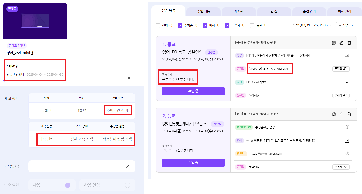 | Description | 마이그레이션 후 과목 상세 정보가 누락되는 현상 수업기간, 과목, 수강생 설정 등이 누락되어 있습니다. | ||||