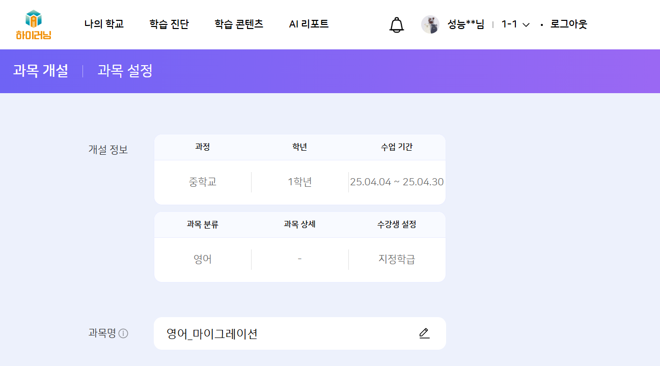 | Steps To Reproduce | 1. 25test1 계정 로그인 2. 영어_마이그레이션 과목 상세 진입 3. 수업 설계 내용 확인 4. 영어_마이그레이션 수정 버튼 클릭 5. 개설 정보 및 과목명 확인 | ||||