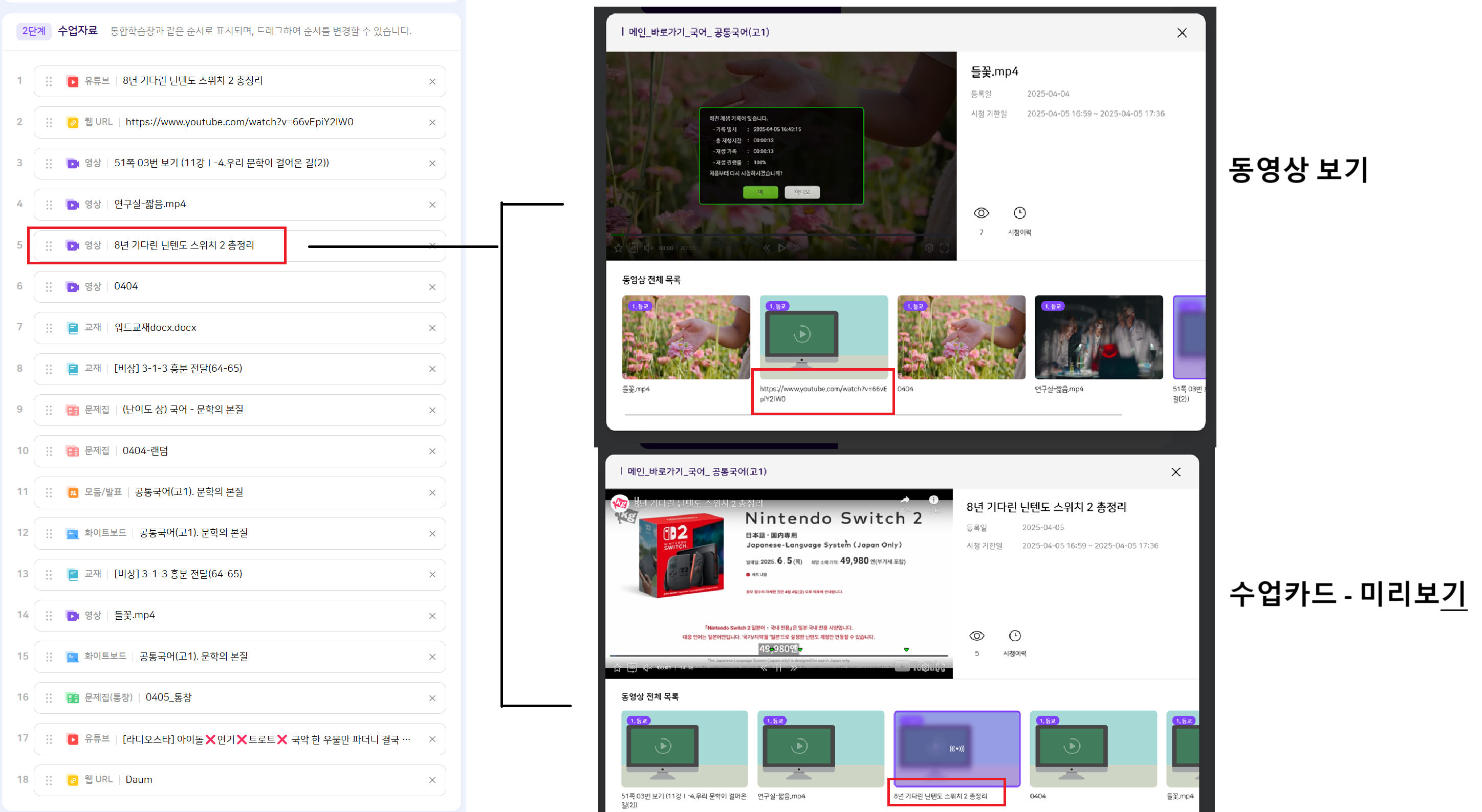 | Description | 1. [동영상 보기] 클릭 > 미리보기 팝업에서는 링크 주소 노출됨 2. 수업 카드 - 미리보기 팝업에서는 영상의 제목으로 노출됨 | ||||
