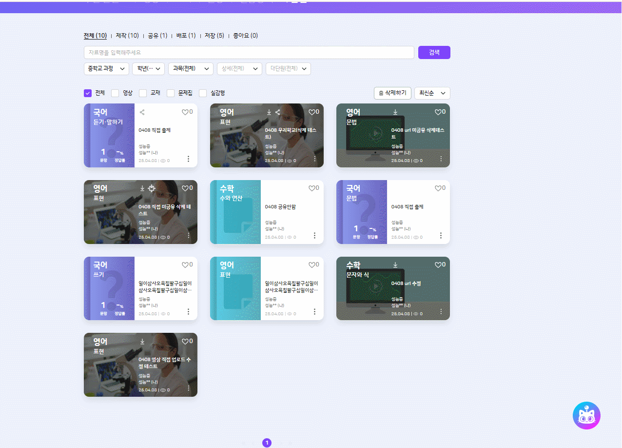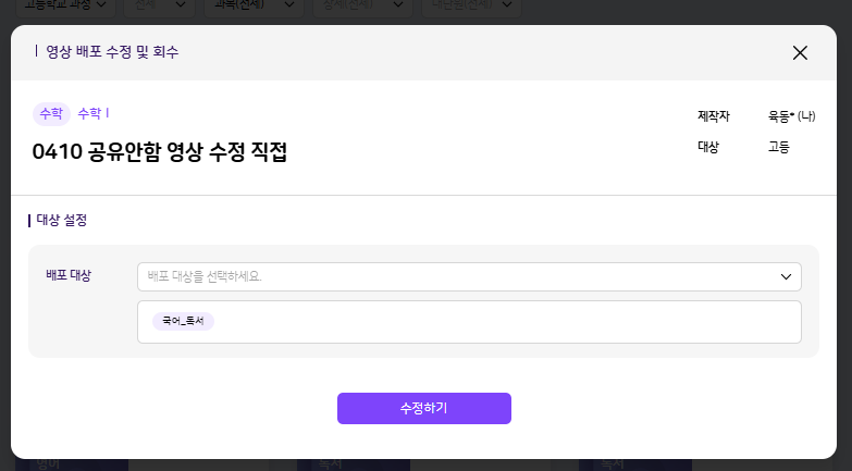 | Description | 수업 설계로 자동 배포된 학습 콘텐츠의 배포 해제 시 삭제가 불가해지는 현상 - 교재는 설계 시 무한로딩으로 체크하지 못했습니다. -영상/문제집 동일 | ||||