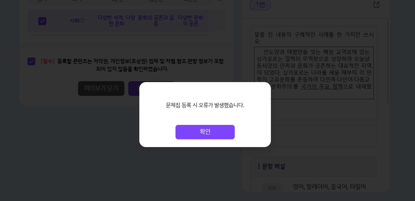 | Steps To Reproduce | 1. 교사 로그인(서술형은 중고등학교만 가능) 2. 학습콘텐츠 > 문항 > 서술형 3. 서술형 임시저장 4. 서술형 수정 5. 오류 팝업 확인 | ||||
