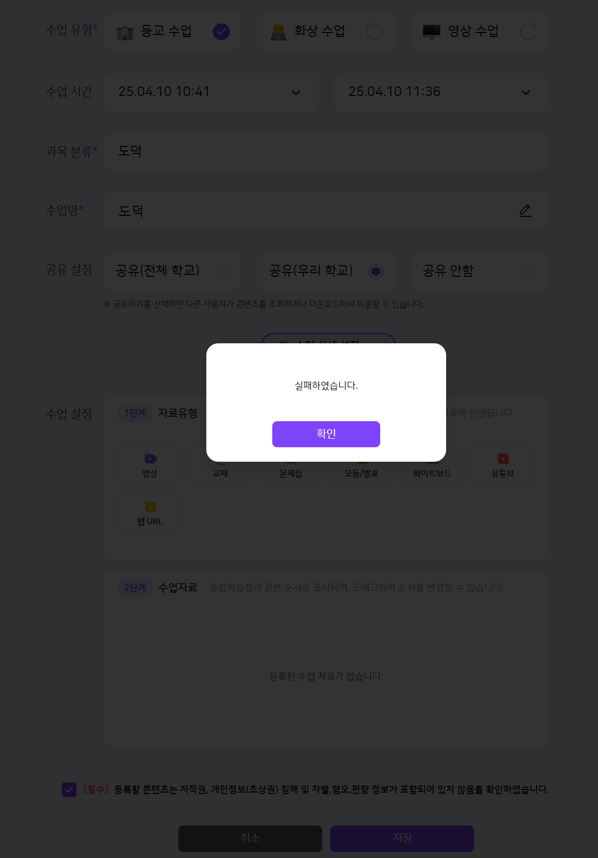 | Summary | 0000822: 중학교 1학년 - 도덕 수업 생성시 수업 생성 실패 하는 현상 | ||||
