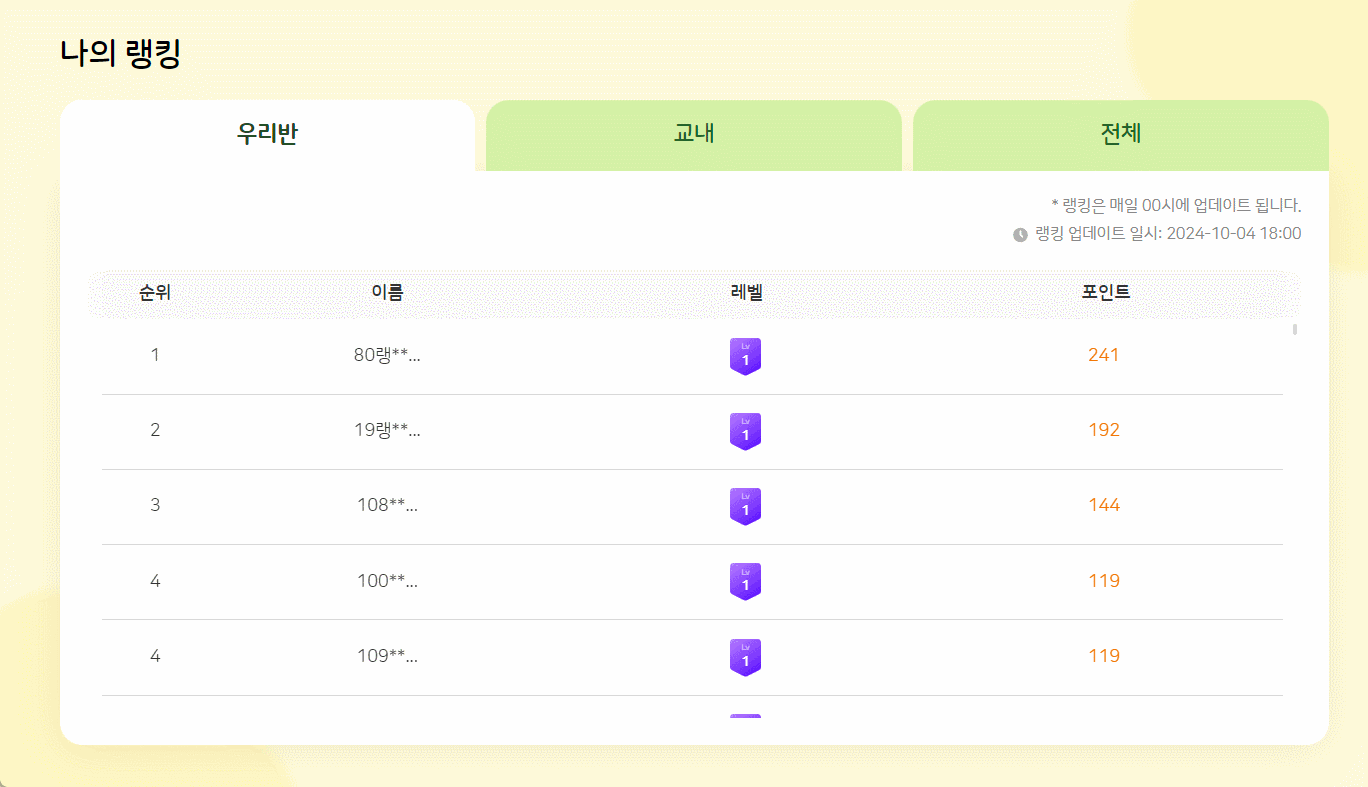 | Steps To Reproduce | 1. 학생 로그인 ( 10~ 50위) 2. 나의 랭킹 영역 (우리반, 교내, 전체 ) 탭 확인 3. 반 랭킹 영역 ( 교내, 전체) 탭 확인 | ||||