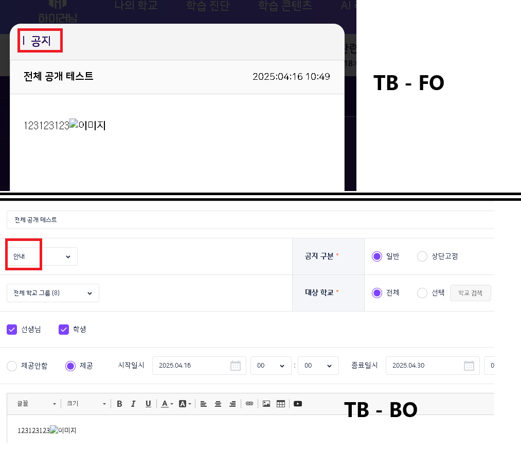 BO에서 안내,자료,기타,공지로 등록해도 FO에서 공지로 노출되어야 하는것으로 기획 확인 했습니다. |