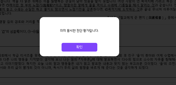 | Description | 학생은 응시하지 않은 학습진단이 교사는 응시 완료라고 노출되는 현상 학생 : 미응시 학습진단 클릭시 응시 완료했다는 팝업 노출 | ||||