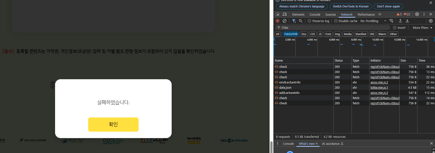 직접 업로드는 정상 업로드 되는데 AI 추천 영상, 외부링크, 영상 콘텐츠 조회 통해서 등록한 영상이 "실패하였습니다." 팝업 노출됨 |