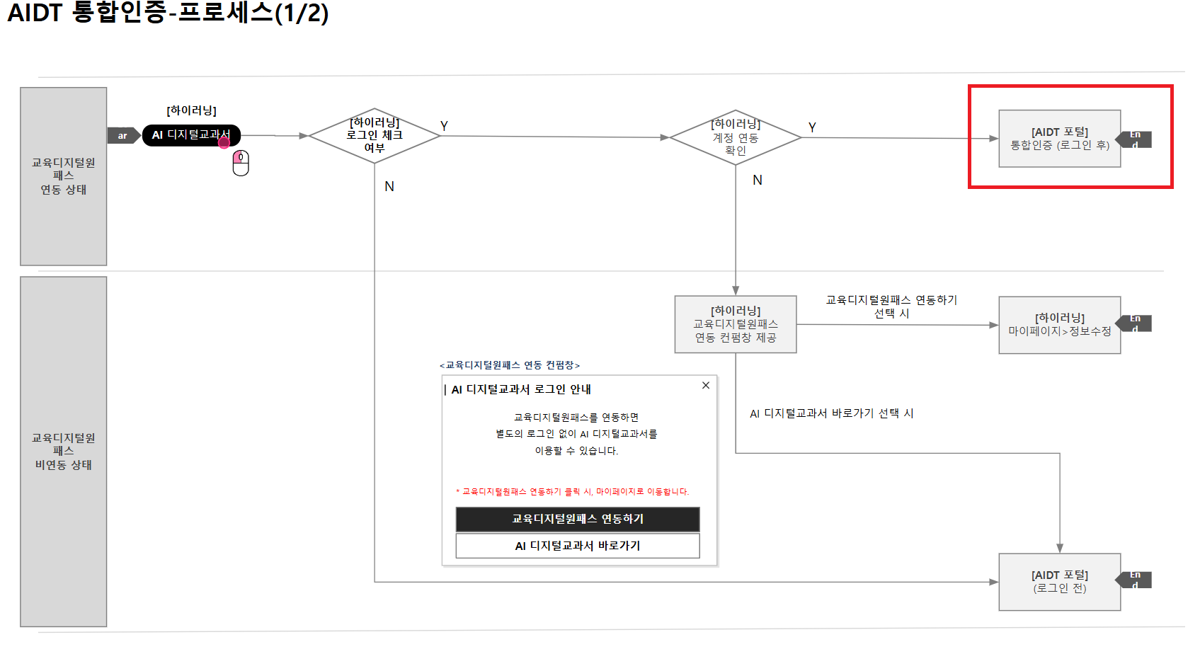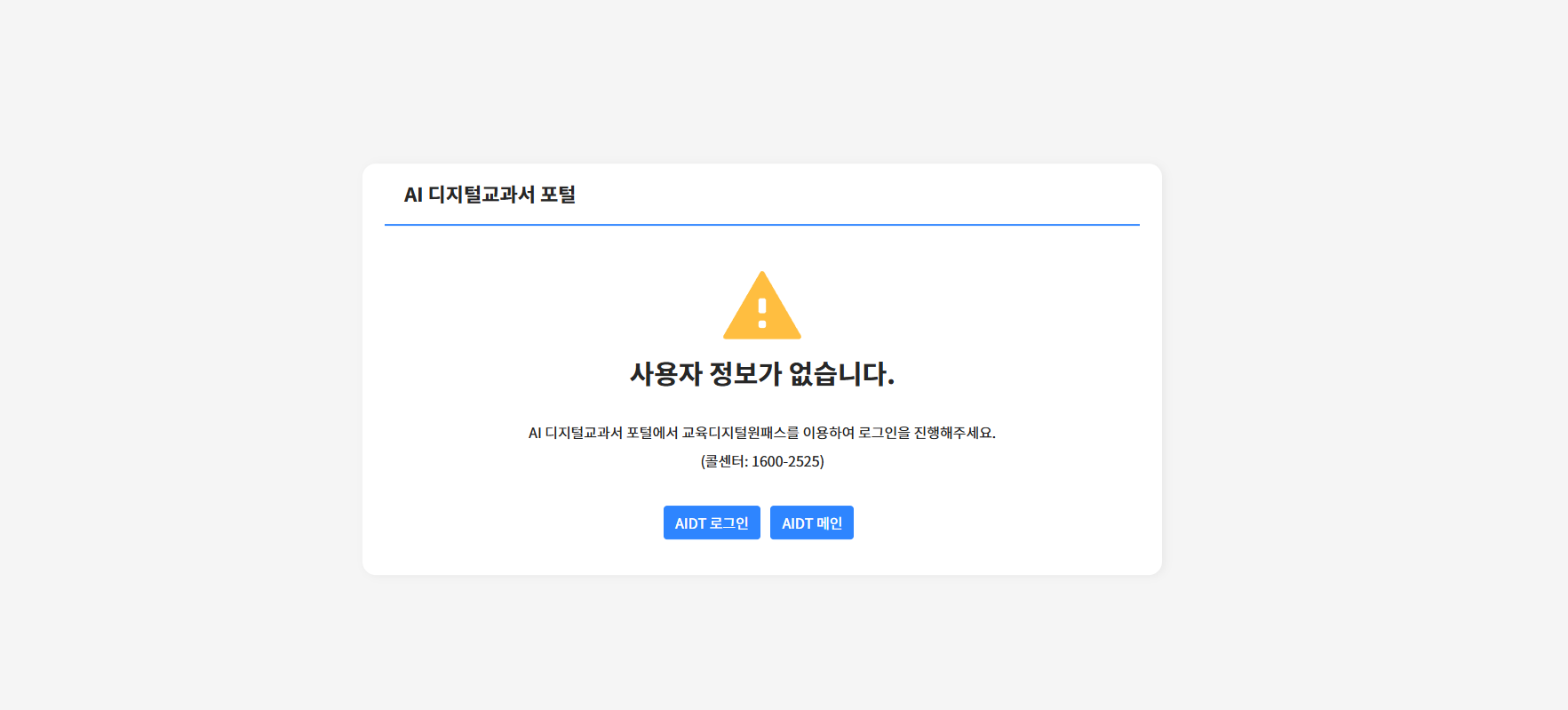 | Description | 하이러닝 Y, 디지털원패스 Y 인데 AI 디지털교과서 버튼 클릭 시 나오는 화면이 기획과 상이한 현상 기획 : AIDT 포털 통합인증(로그인 후) 화면 TB : 사용자 정보가 없습니다 | ||||