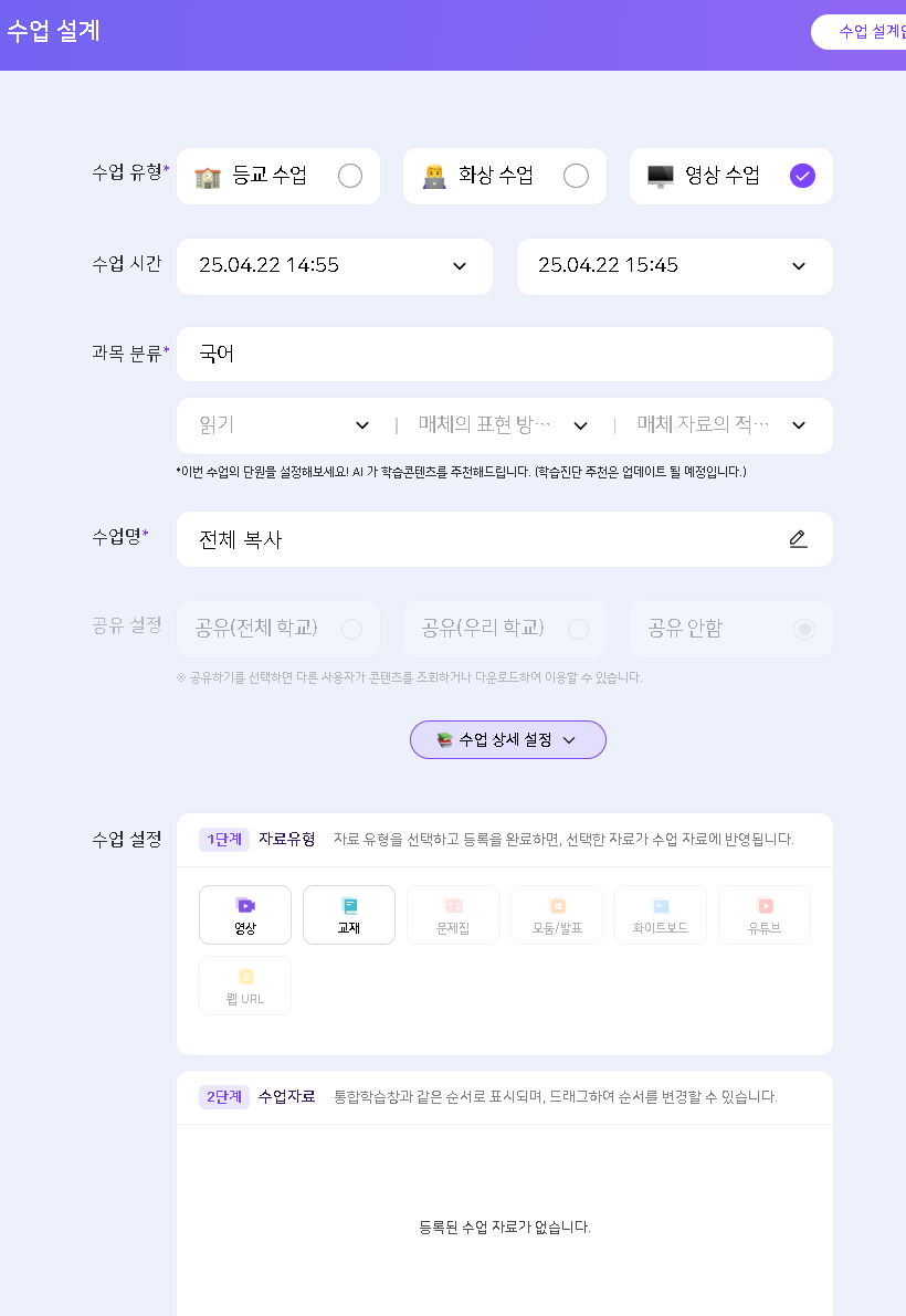 | Steps To Reproduce | jw02 > 나의 수업 > "국어" 과목 클릭 > 복사되어있는 수업 설계하기 & 시간 설정 클릭 | ||||