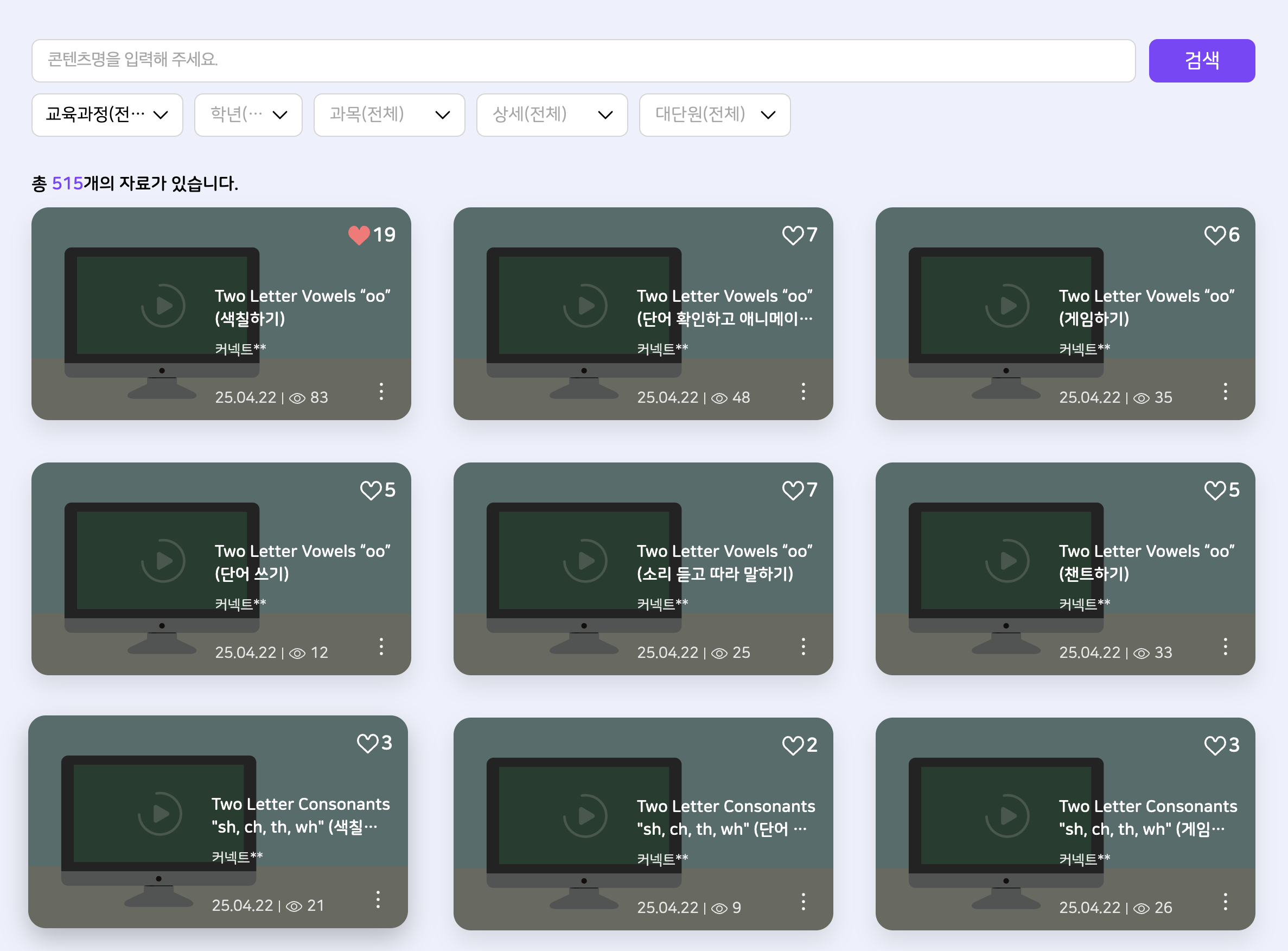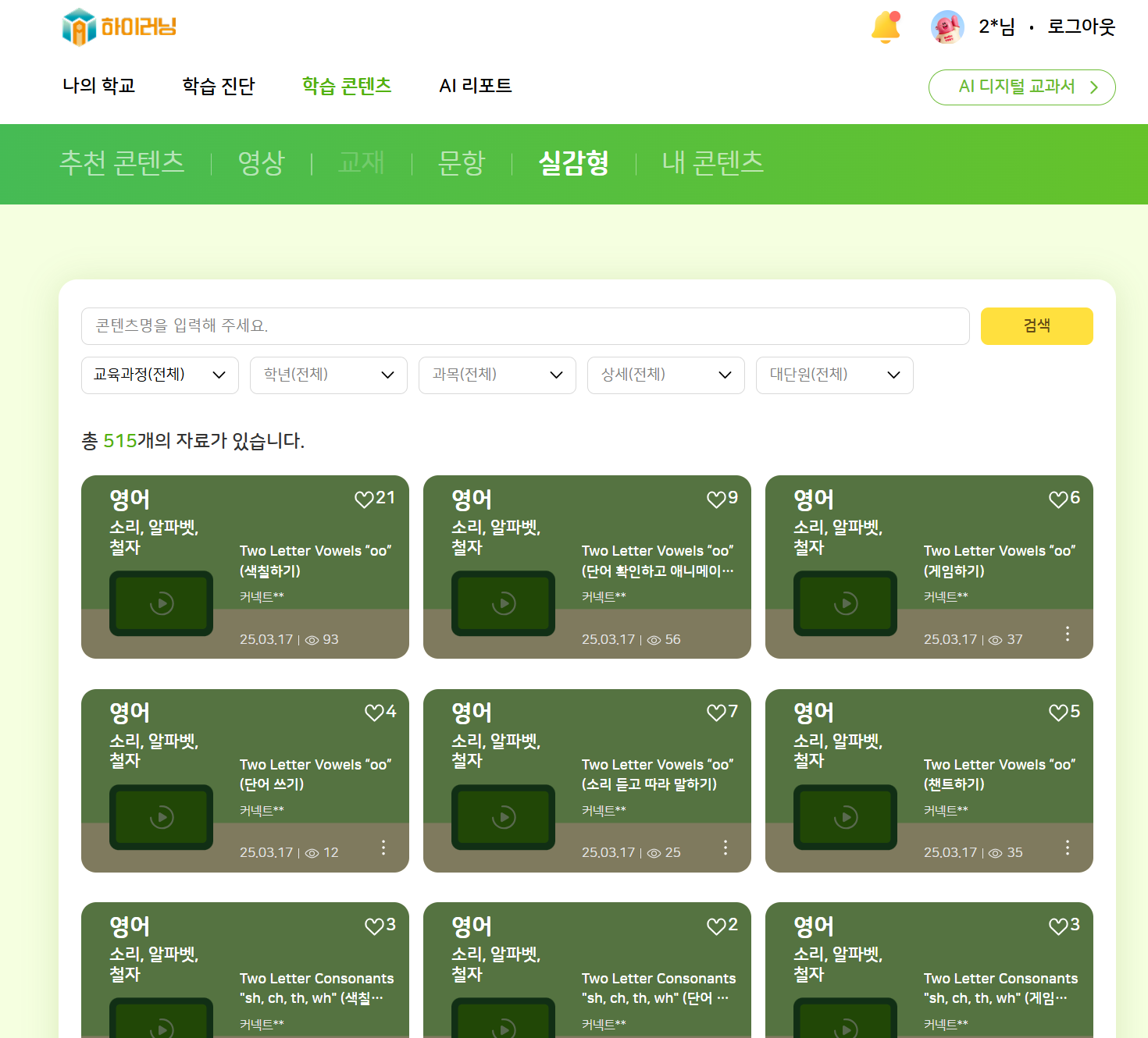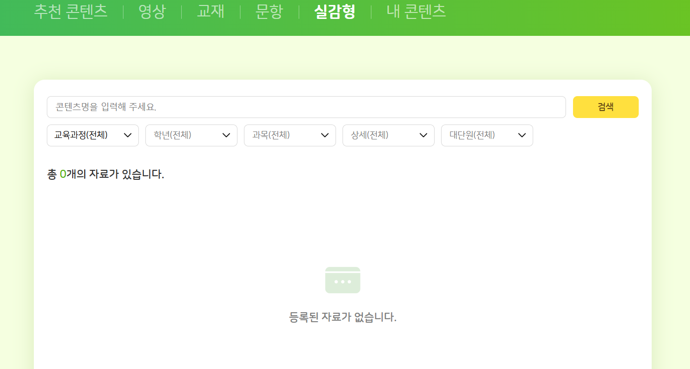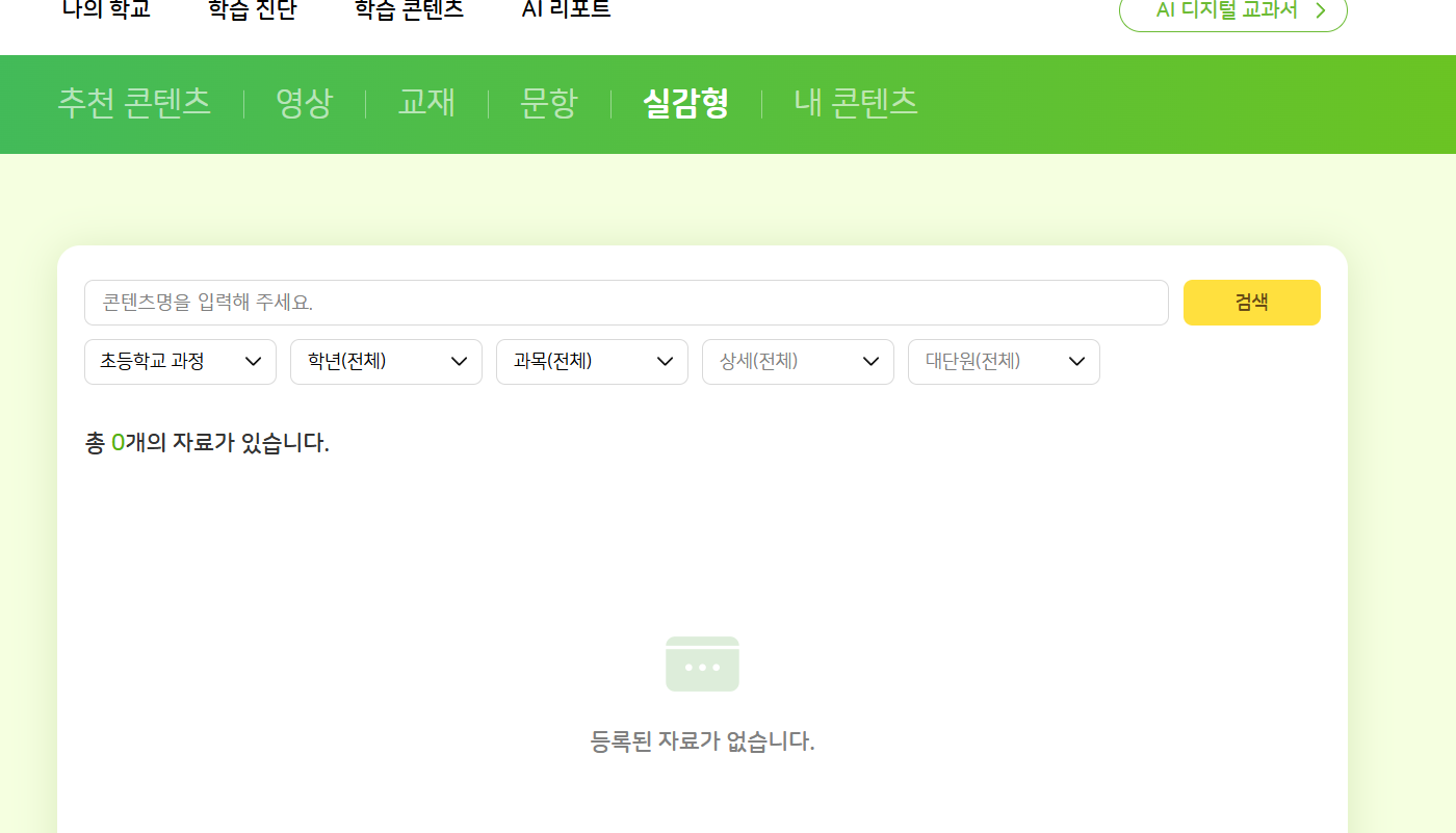 초1,2 분류체계 변경 후 실감형 콘텐츠 미노출 -교육과정(전체) 필터 -초등학교 과정 필터 |