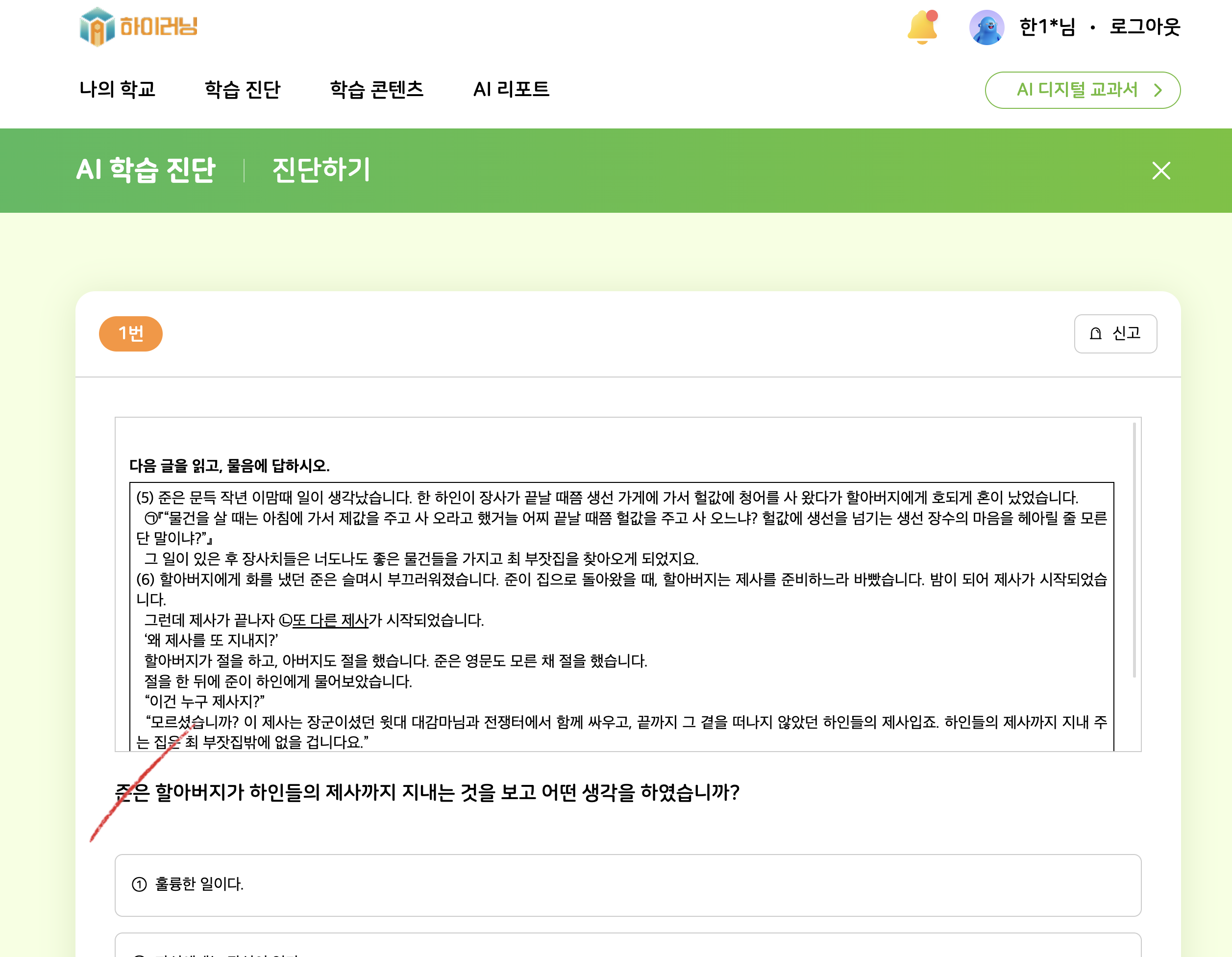 | Steps To Reproduce | 1. 비둘기날개초등학교2 4-1-1 로그인 2. AI 학습진단 > 국어 - "생각과_느낌을_나누어요 진단 클릭 3. [오답노트] 버튼 클릭 | ||||