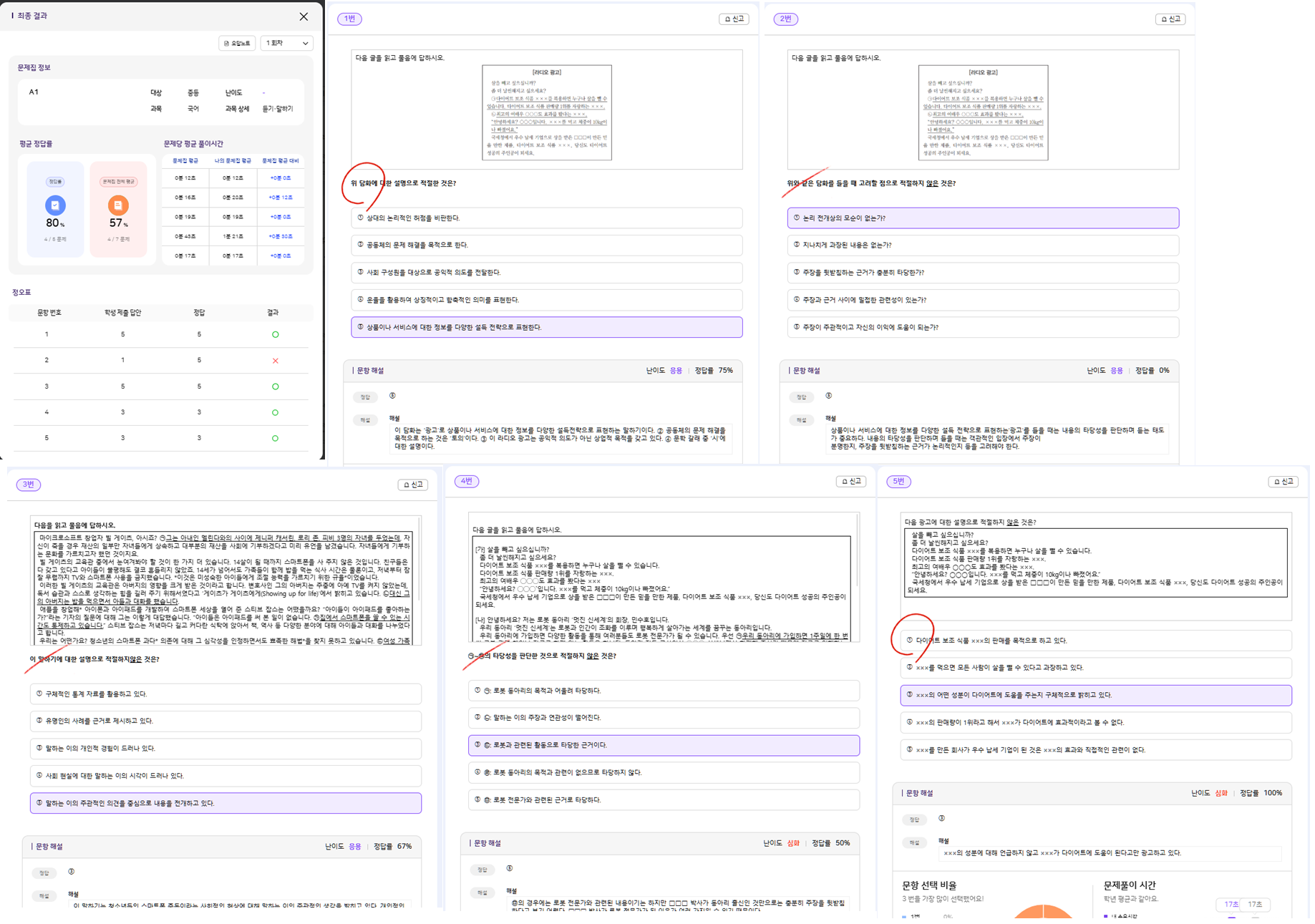 1.학생 로그인 2. 학습 콘텐츠 > 문항 > AI 추천 출제 3. 중1 > 국어 > 듣기 말하기 - 추론하며 듣기 - 추론하며 듣기에 대해 이해하기 > 문항 개수 5개로 생성 4. 문제 풀이, 답안 및 문제 순서 체크 5. 오답노트에서 문제 순서 및 정답률 확인 * 해당 이슈 확인 시 학생이 풀이한 답안의 순서는 고정이고 문제의 순서가 변경됩니다. 그런데 문제랑 답안을 매치하는지 정오표와 오답노트가 상이하게 노출됩니다. |