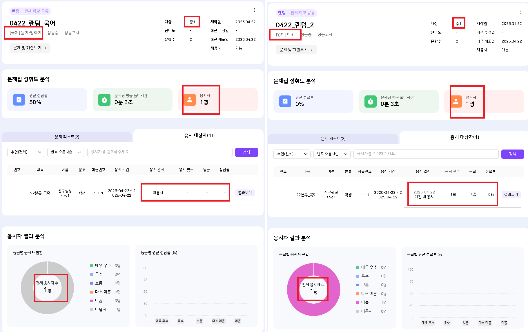 | Description | 중1 마이그레이션 이후 문항-랜덤 출제 배포 후 풀이 완료 했는데 미응시라고 노출되는 현상 국어 과목 : 응시 완료와 미응시가 혼재되어서 노출됨(비정상) 영어 과목 : 응시 완료라고 노출(정상) | ||||