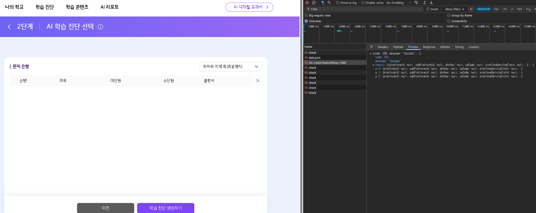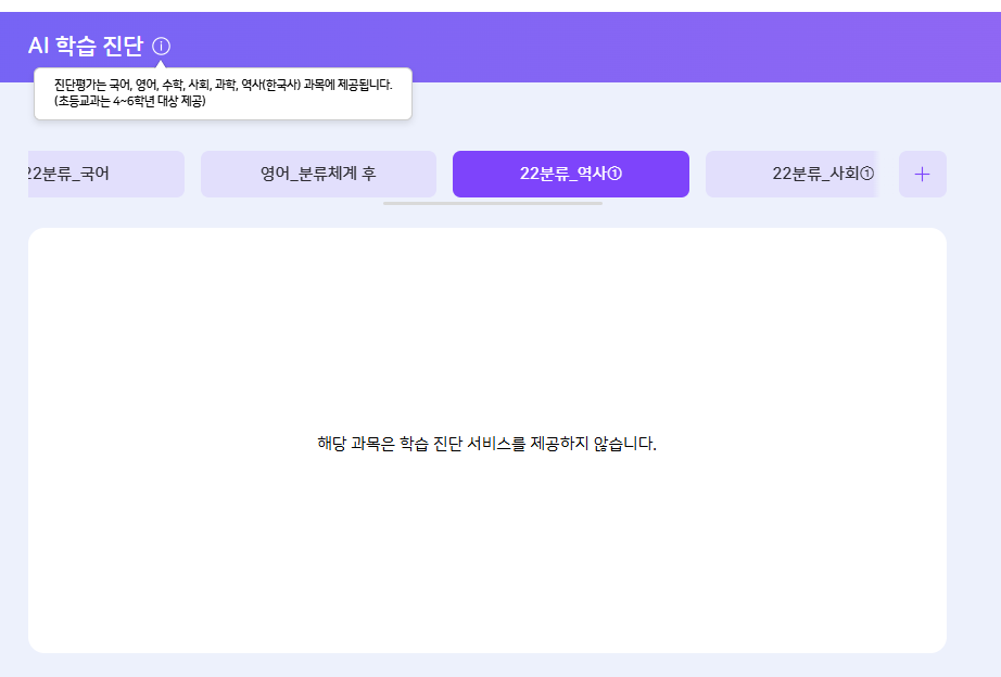 | Description | 중1 - AI 학습진단 - 역사1, 사회1 과목 진단 문제 출제하지 못하는 현상 발생 사회1 : 문제 은행에서 문제가 미노출됨 역사1 : 과목 선택시 단원별 학습 진단 리스트 미노출 | ||||