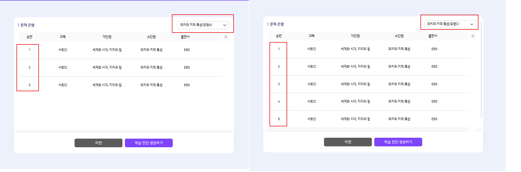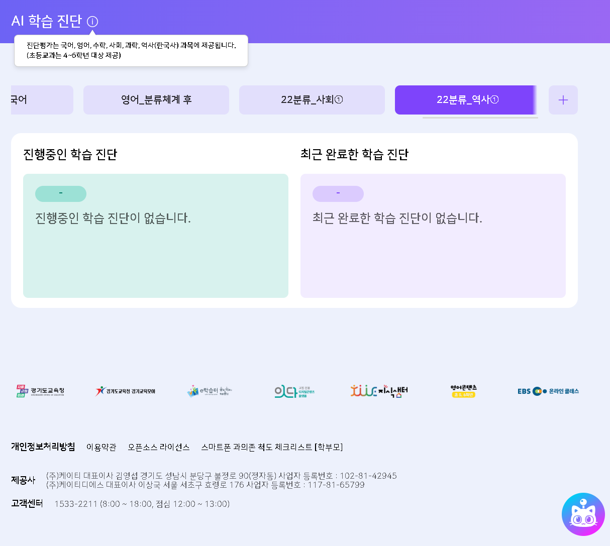중학교 1학년 기준으로 역사1: 증상 동일 사회1: 문항 개수 확인 필요 (위치와 지역 특성) 진단하기 시 문항수가 적게 노출됩니다. *스크린샷 참고 |