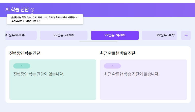 중1 역사1 : 진단, 과목리포트, 종합리포트 영역 추가 확인 필요합니다. |