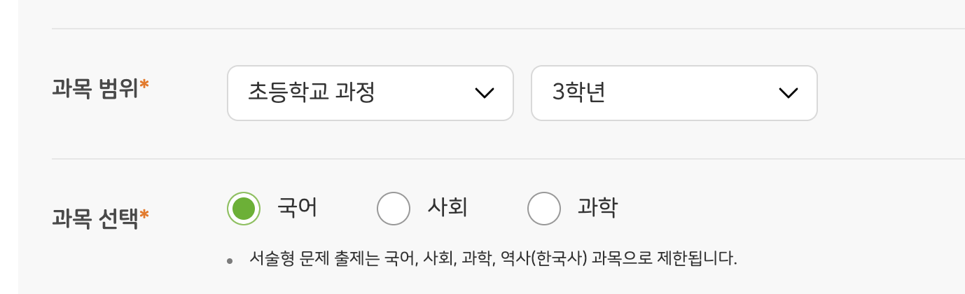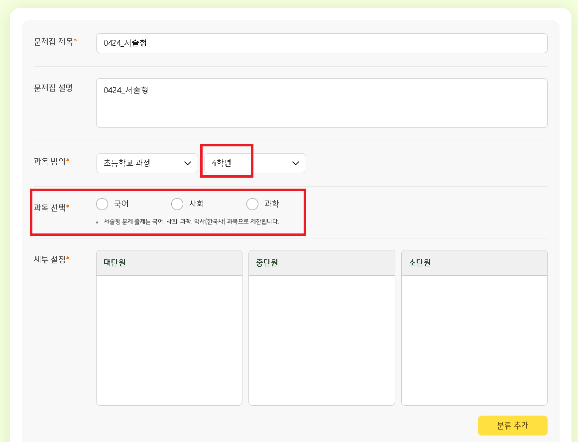 | Summary | 0000887: 초3,4 학년 서술형 문항 출제시 과목 선택 안되는 현상 | ||||