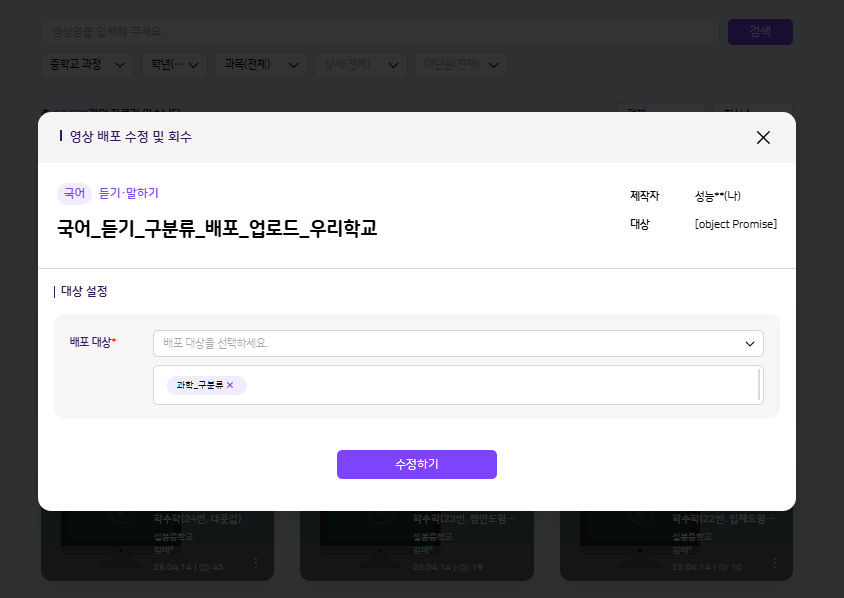 Description학습 콘텐츠 - 영상 - 내가 등록한 콘텐츠 배포 버튼 클릭 시 대상 "object Promise" 로 표기되는 현상
