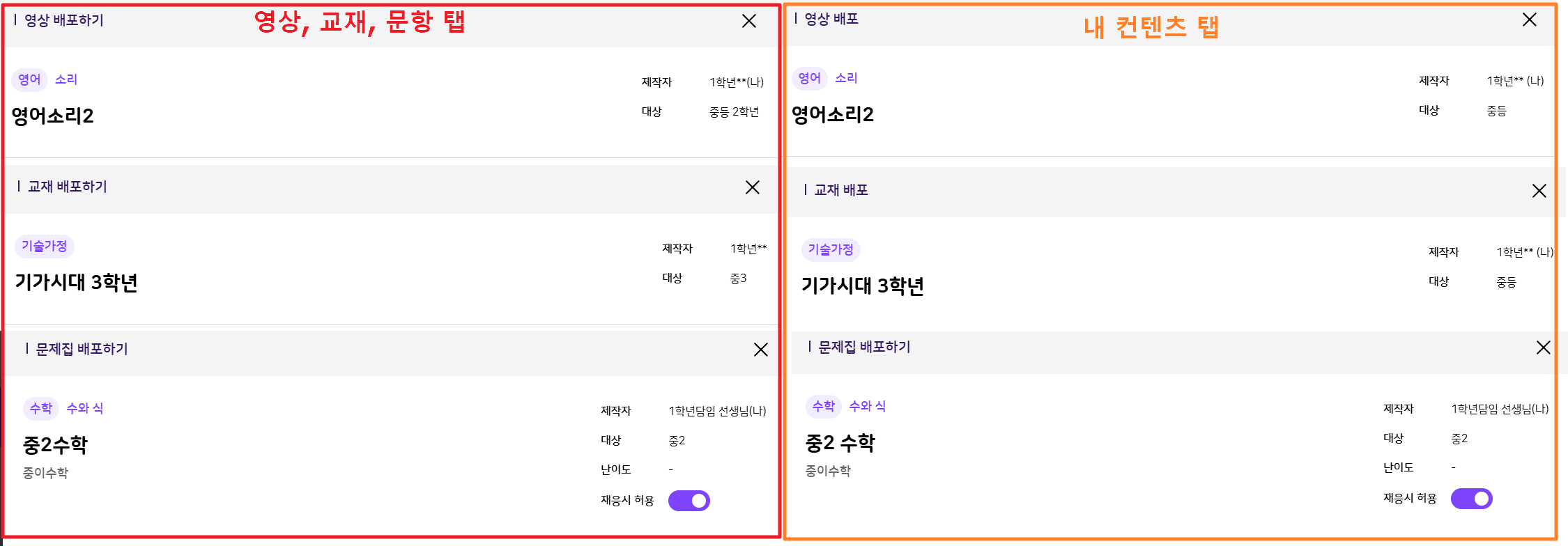 1. 영상, 교재, 문항 탭에서 노출되는 제작자, 대상이 내 컨텐츠 탭 텍스트와 다르게 노출되는 현상