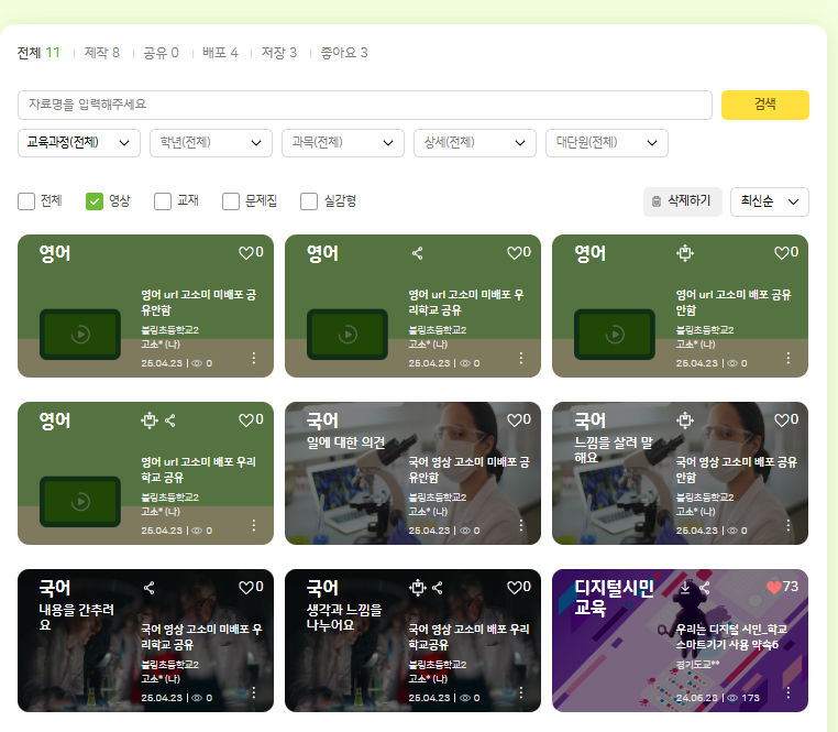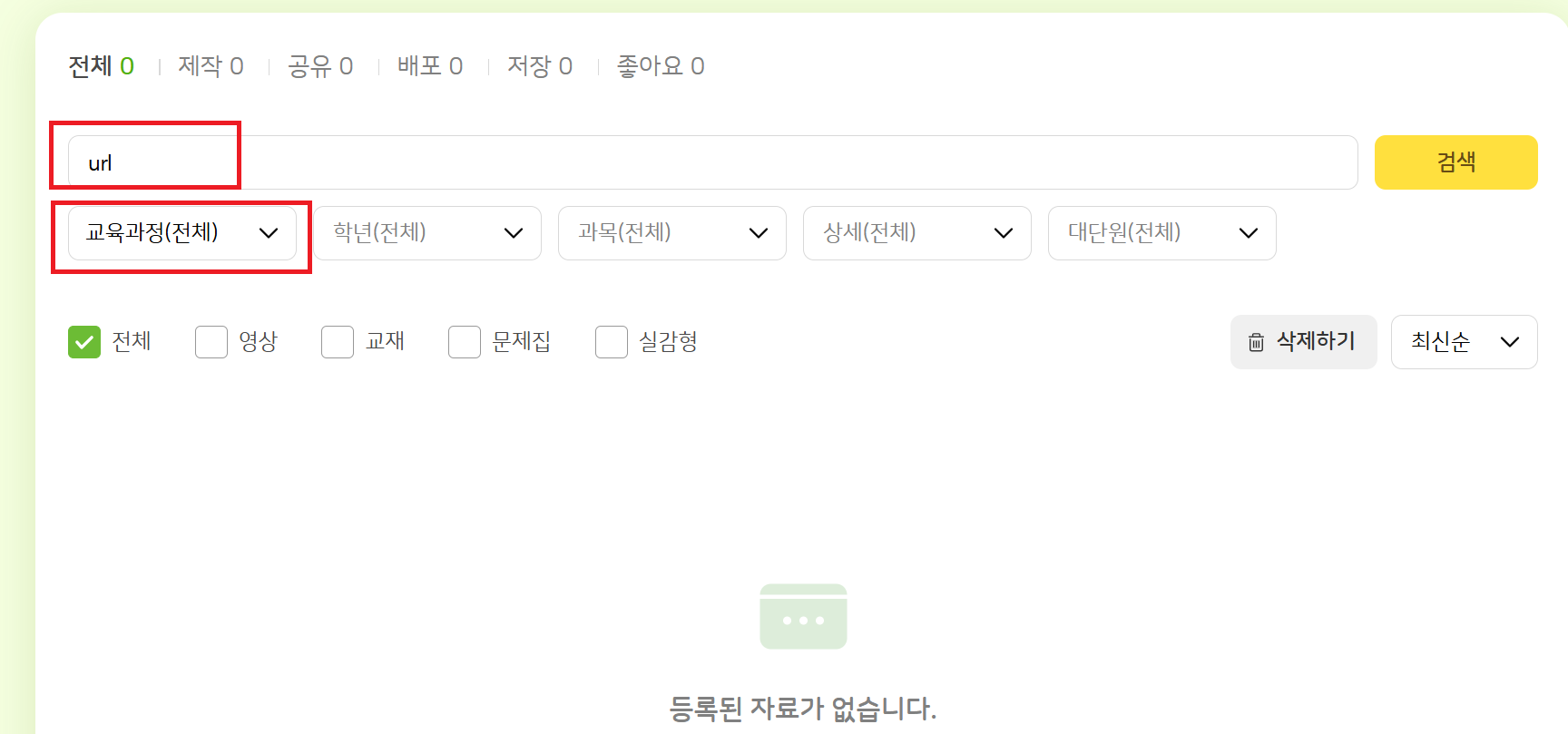 | Steps To Reproduce | 1. 분류체계 전 ksm 교사가 학습콘텐츠>영상>url로 등록했던 4개 영상 -영어 url 고소미 미배포 공유안함 -영어 url 고소미 미배포 우리학교 공유 -영어 url 고소미 배포 공유안함 -영어 url 고소미 배포 우리학교 공유 2. 분류체계 후 교육과정(전체) 필터 걸어도 위의 4개가 검색되지도 노출되지도 않음 | ||||