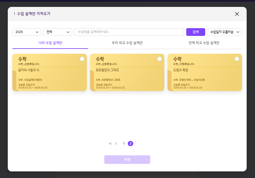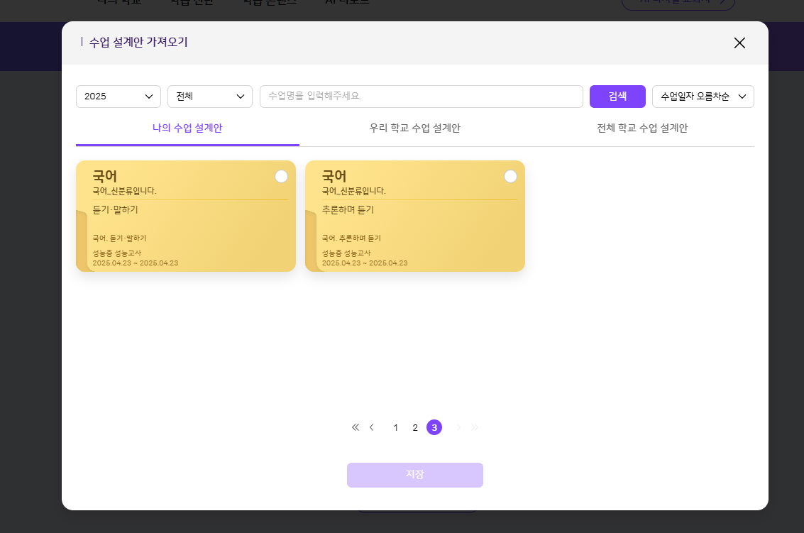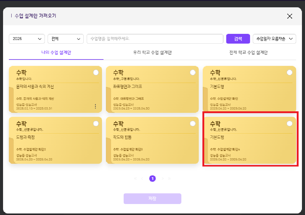| Description | 신 분류체계가 적용된 과목의 수업설계안 가져오기 팝업 페이지네이션 오동작 중1. 국,수,사,역,과 | ||||