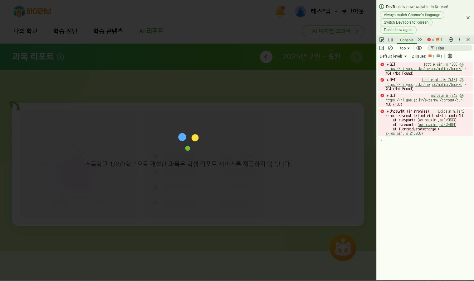 | Description | 초1~3 학생으로 AI리포트 - 과목 리포트 진입 시 무한로딩이 발생되는 현상입니다. ※ 초1~3 교사 및 초4 이상 학생에서는 발생되지 않습니다. | ||||