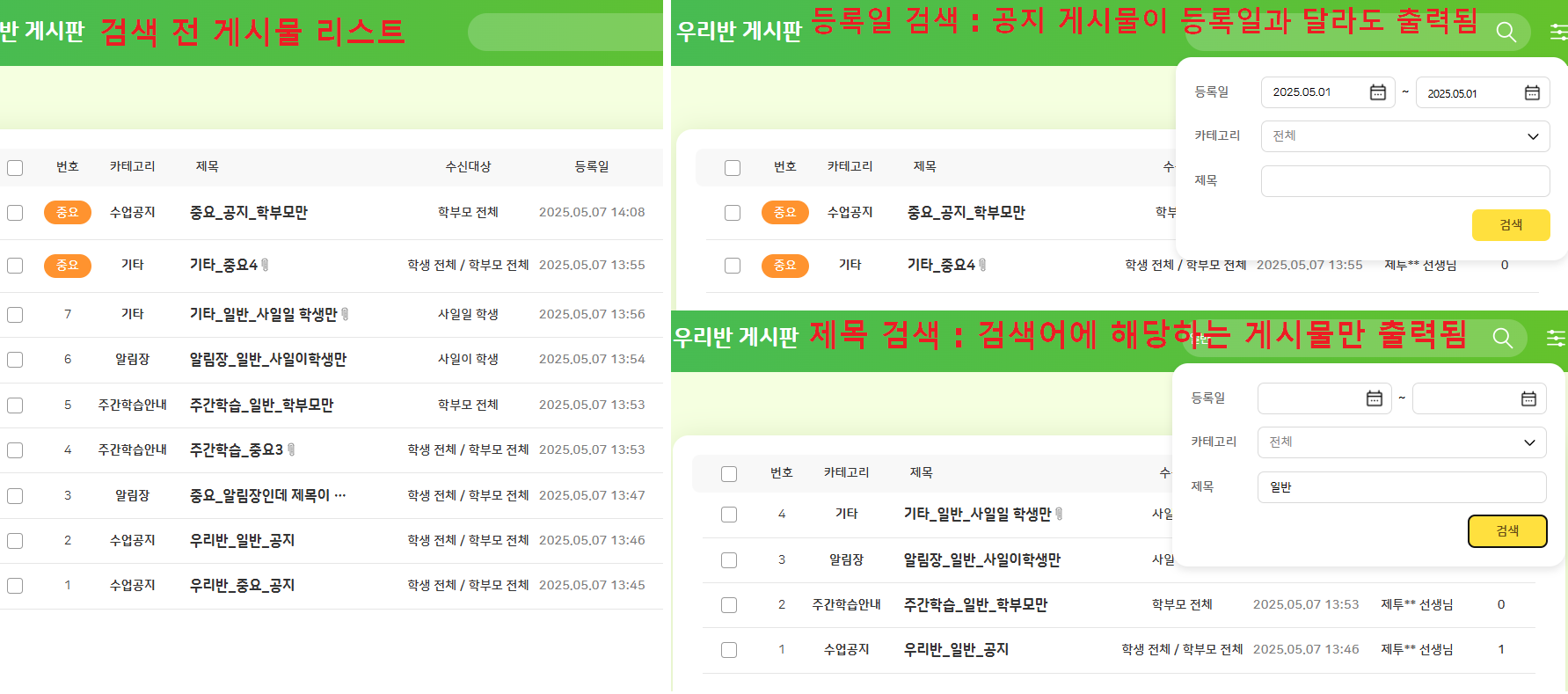 | Description | 우리반 게시판에서 검색 시, 중요 게시물이 상황에 따라 미노출되는 경우가 있습니다. 중요 게시물은 기획서 상 고정 노출되는 것으로 표기되어 있는데, 검색할 때도 검색 결과에 관계없이 항상 노출되어야하는지 문의 드립니다. ※ 현재 검색 시 보여지는 결과 - 날짜 검색 : 중요 게시물이 날짜에 해당하지 않아도 노출됨 - 카테고리 & 제목 : 검색 내용에 해당하지 않는 중요 게시물은 노출되지 않음 | ||||