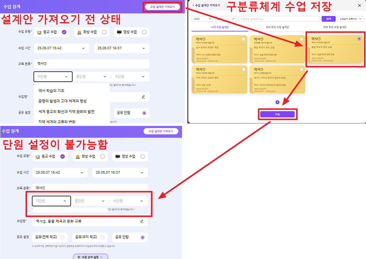 | Description | 중1 역사①, 사회① 수업 설계 화면에서 15분류체계 수업 가져오기 시 단원 설정이 불가능한 현상 | ||||