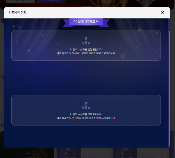 | Steps To Reproduce | 1. 초,중,고 교사 로그인 2. 학습 콘텐츠 > 추천 콘텐츠 > 명예의 전당 3. [수상자 명단 보기 ] 버튼 클릭 4. 팝업 확인 | ||||