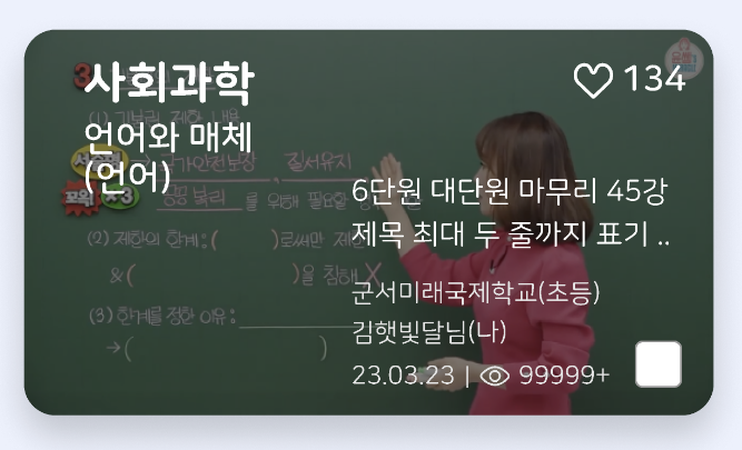 안녕하세요. 조회수는 99999 이상일 경우 ‘+’ 표기(예: 99999+)로 개발 반영 부탁드립니다. 또한, 체크박스 위치는 우측 상단으로 변경하는 방안도 검토했으나, ‘내 콘텐츠 > 삭제하기’ 시 좋아요 영역과 겹치는 이슈로 인해 첨부드린 이미지와 같이 표기되는 CASE로 추가 적용 부탁드립니다. 감사합니다. |