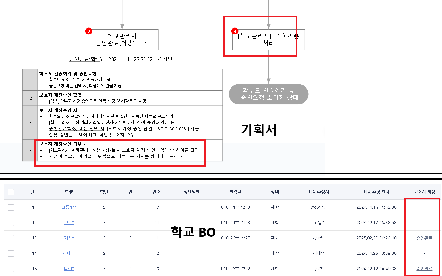 | Description | 학교 BO - 학부모 계정 승인 거부시 표기 방법 기획 문의 드립니다. 보호자 계정을 신청하지 않았을 시 디폴트 값으로 '-' 하이픈을 넣고 있는데 기획서 : KT LanEdu_학교관리자_화면설계서_v.2.0.11_수정 - P.48에 보면 "학생이 부모님 계정을 인위적으로 거부하는 행위를 방지하기 위해" 하이픈 표기를 넣는다고 되어있습니다. 승인 거부시 하이픈을 표기하면 결국 디폴트 값과 같아지게 되어 기획 문의드립니다. | ||||