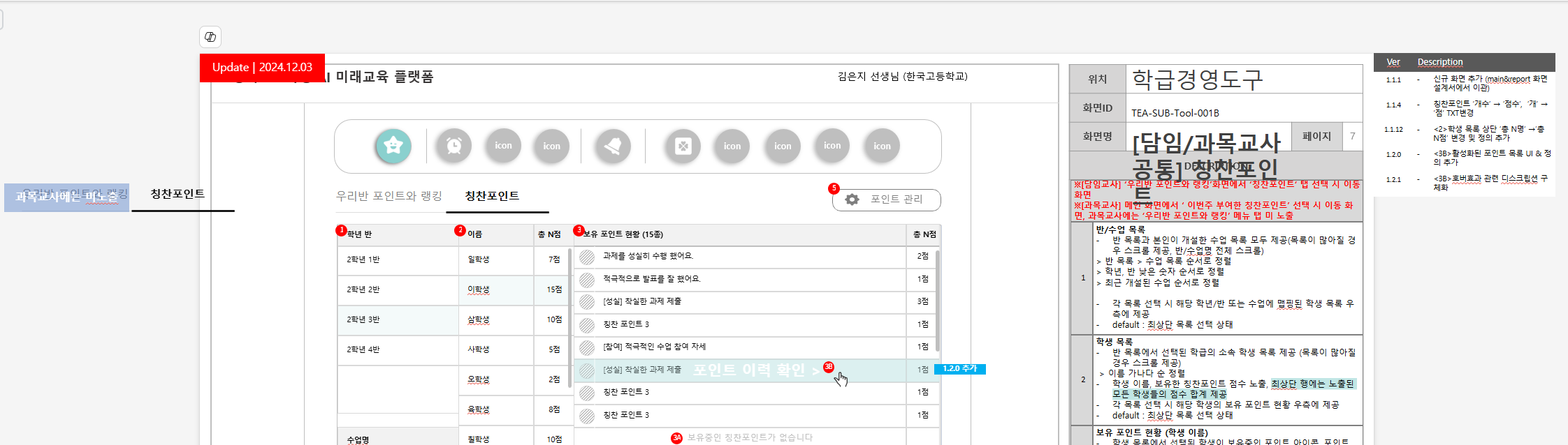 화면 설계서 [학습경영도구 v1.2.4] >> 7p 기준 담임/과목 교사의 칭찬포인트 탭의 화면이 다소 다릅니다. 포인트 관리 버튼은 잘 노출 되는상황입니다. 확인부탁드립니다. |