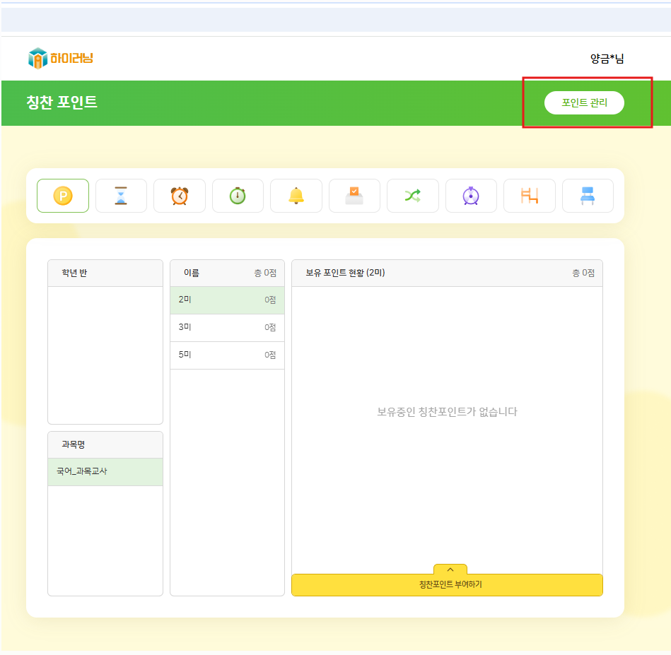 과목 교사의 경우 탭이 없어 해당 위치에 포인트 관리 버튼 디자인 했을 것으로 생각됩니다. 버튼 위치는 이슈 없음으로 확인 부탁드립니다. |