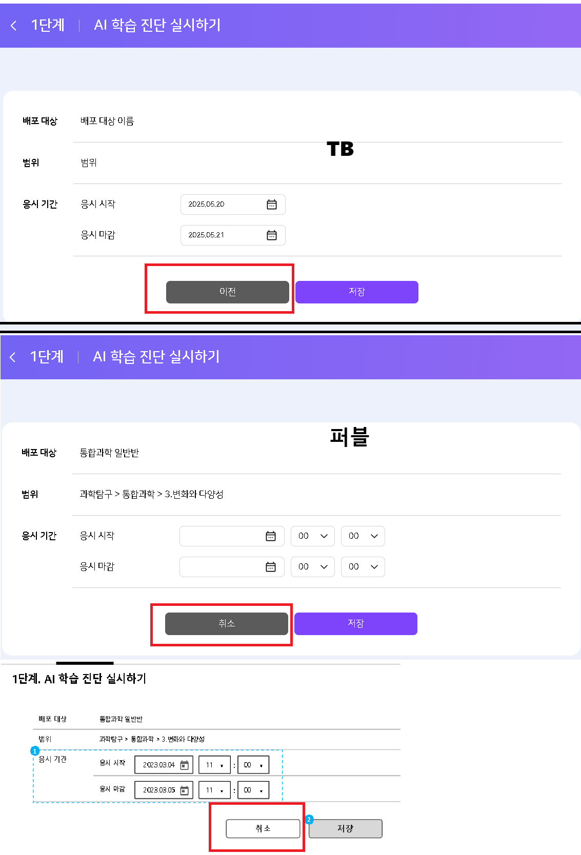 | Description | AI 학습진단 - 기간수정하기 페이지 [취소]로 노출되어야 하는데 [이전]으로 노출됨 | ||||