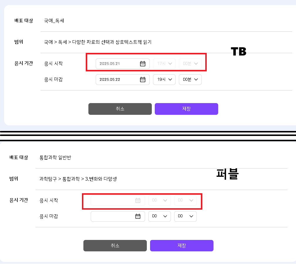 | Description | AI 학습진단 - 기간 수정 페이지 : 진행중일경우 응시 시작 영역 비활성화 안되는 현상 응시 시작 영역 시간은 비활성화 되었지만 날자 선택 영역은 비활성화 처리 안됨. (클릭이 안되게 처리한것은 확인 했으나 퍼블과 다름) | ||||