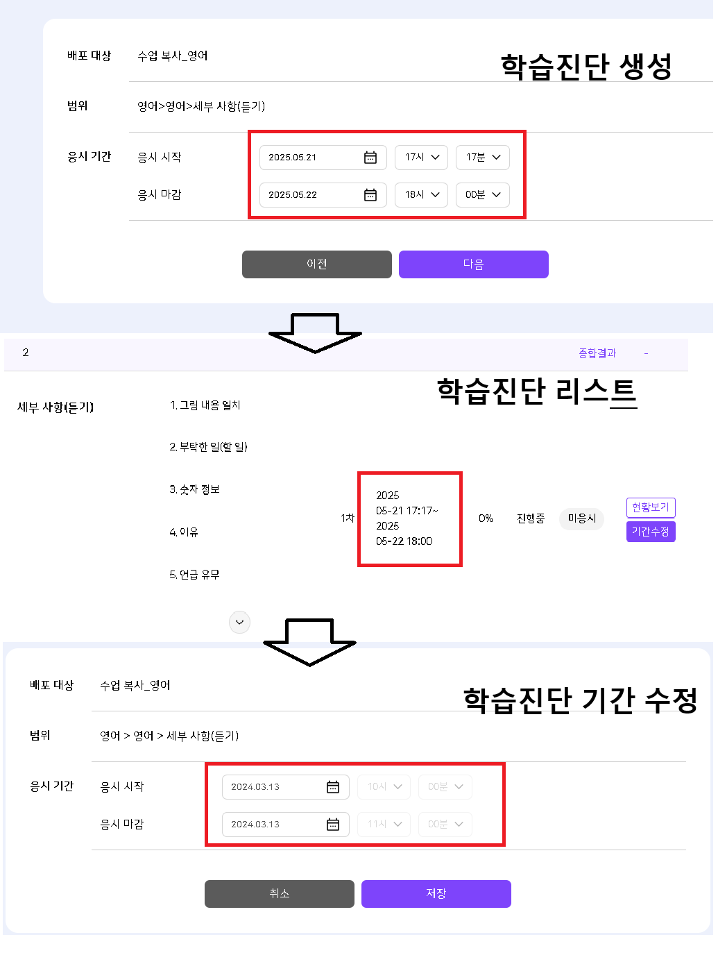 | Description | AI 학습진단 - 종료된 과목에서 진단 생성>기간 수정시 응시기간이 이상해지는 현상 | ||||