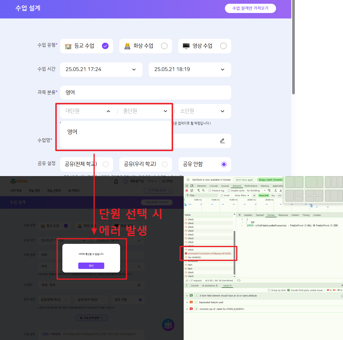 | Description | 중학교 수업 설계 화면에서 단원 목록이 과목으로 출력되는 현상입니다. ※ 과목 이름으로 출력되는 단원 선택 시 "서버와 통신할 수 없습니다." 메시지가 출력됩니다. | ||||