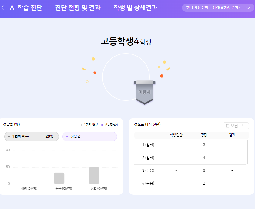 | Steps To Reproduce | 1. mibdda6 계정 로그인 > 1학년 1반 진입 2. AI 학습 진단 : [문학] 한국 서정 문학의 성격 1차시 클릭 3. 학생 별 결과 > 보기 방식 변경 4. 10번 학생 확인 | ||||