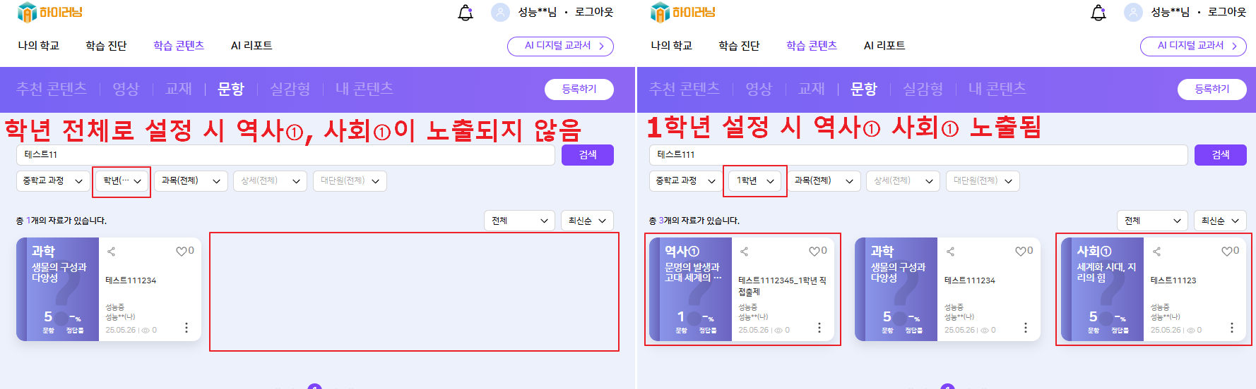 TB에서 역사1 사회1 과목 분류가 노출되는 것을 확인했습니다. 다만, 사회1, 역사1로 생성된 컨텐츠가 '학년 전체'로 설정 시 노출되지 않는 현상이 발생되고 있어 확인 부탁드립니다. ※ 영상, 교재, 문항 모두 발생됩니다. |