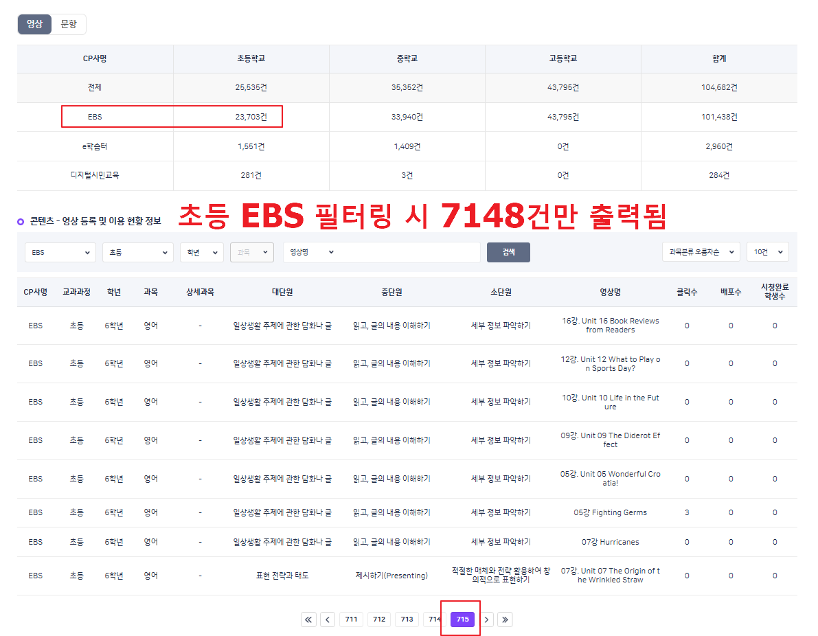 | Description | '콘텐츠 등록 및 이용 현황 정보' 목록에서 만 단위 이상 콘텐츠 필터링 시 일부만 출력되는 현상입니다. ※ ex. 영상 > e학습터 모든 교과과정으로 필터링 시 2960건 전부 출력되나, 초등 EBS 필터링 시 7,148건만 출력됨 | ||||