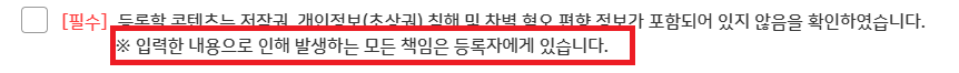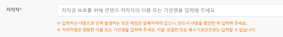 | Description | 영상, 교재 등록 시 저작자 하단 기본 문구가 퍼블과 상이 퍼블 : 2줄 *입력하신 내용으로 인해 발생하는 모든 책임은 등록자에게 있으니, 반드시 내용을 확인한 후 입력해 주세요. *저작자명은 정확한 이름 또는 기관명을 입력해 주세요. 자음·모음만 또는 특수기호만으로는 입력할 수 없습니다. TB : 1줄 ※ 입력하신 내용으로 인해 발생하는 모든 책임은 등록자에게 있으니, 반드시 내용을 확인한 후 입력해 주세요. | ||||