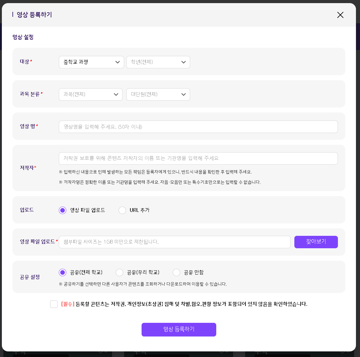 영상 등록 팝업 초등 : testTC 중등 : jw02 |