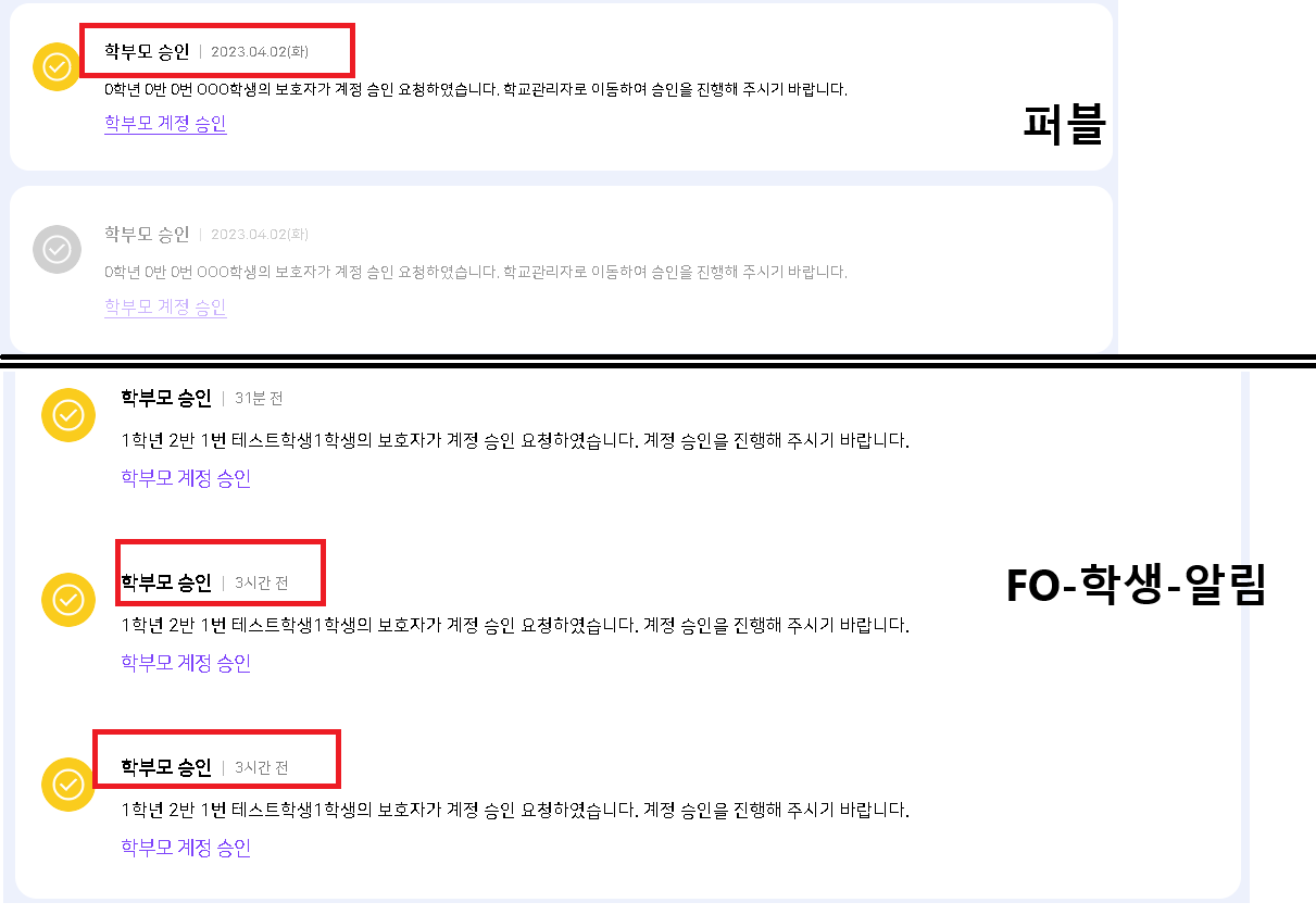 | Description | 학생 - 알림 - 학부모 승인 탭 날자 노출이 퍼블과 상이 | ||||
